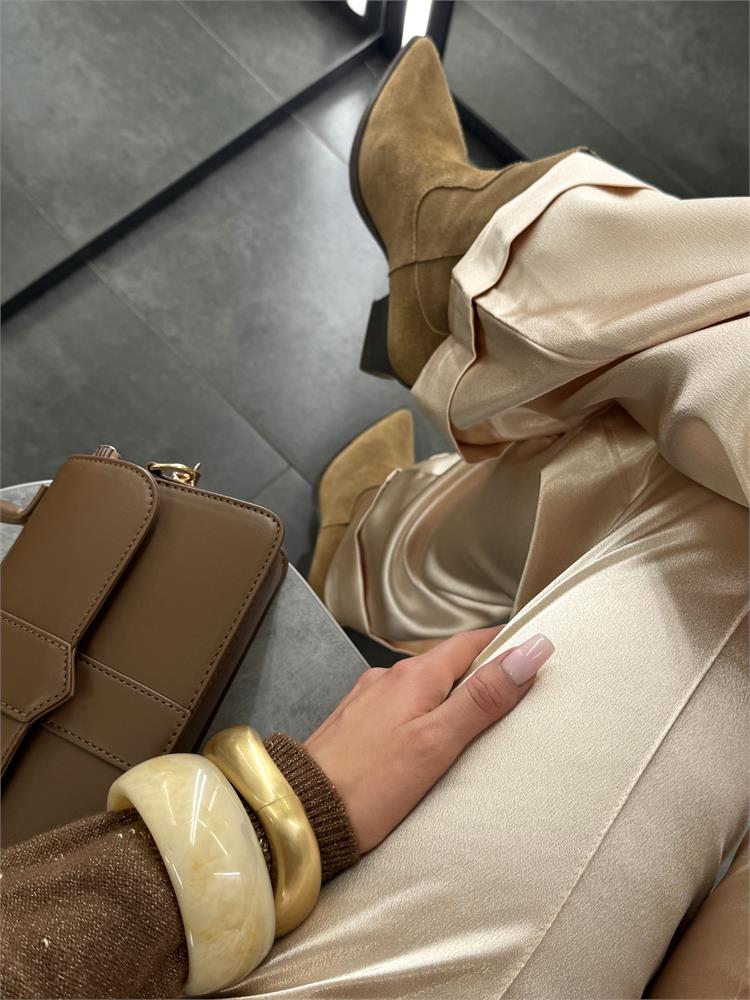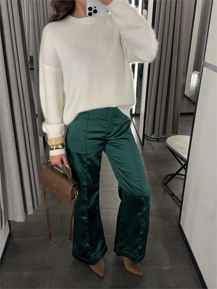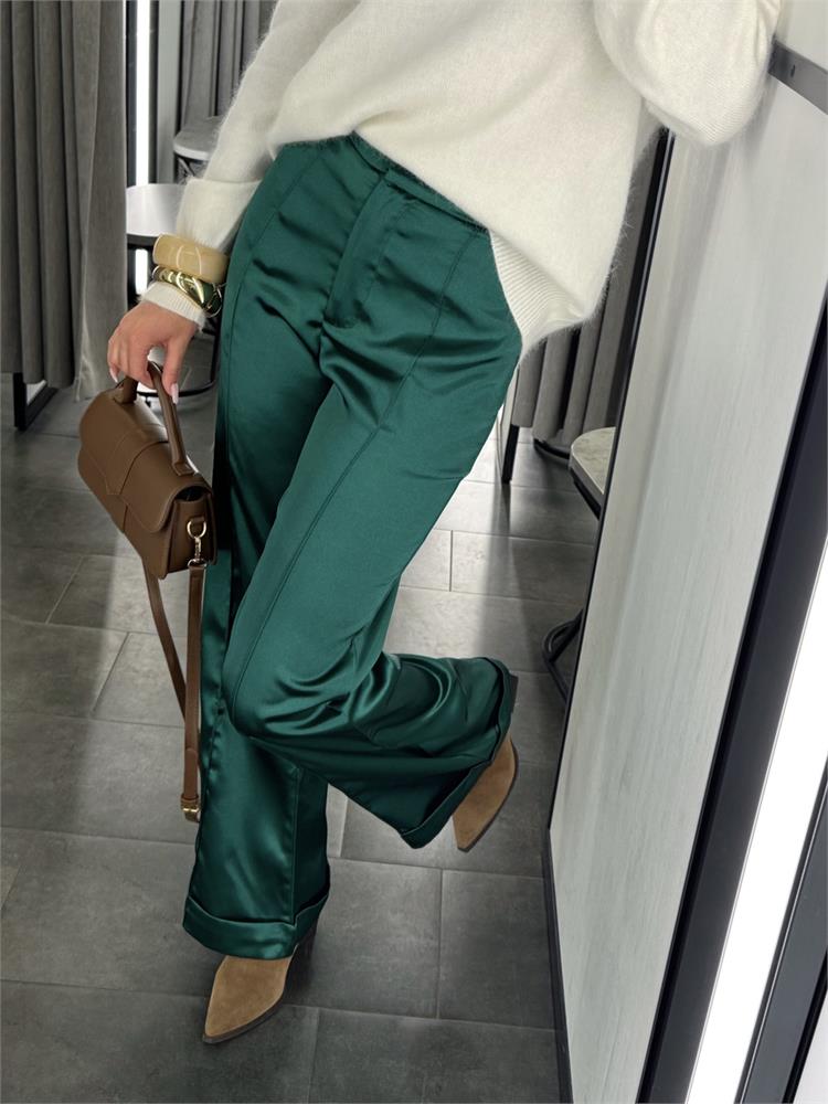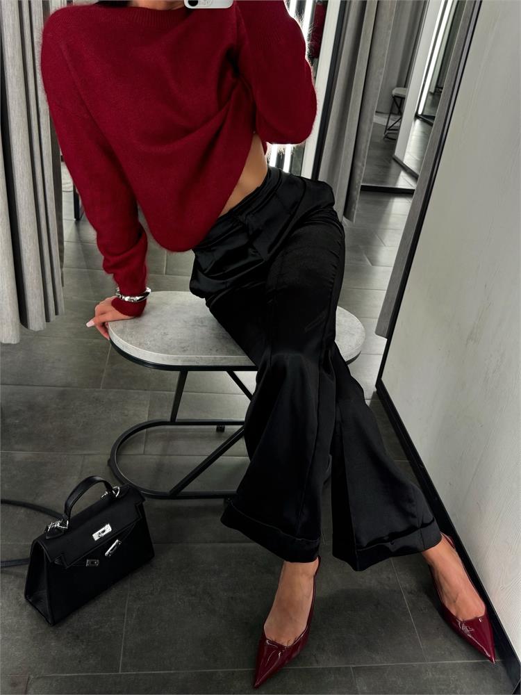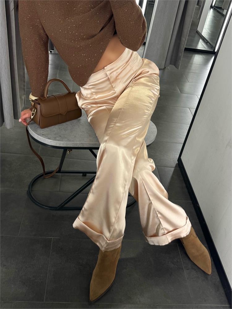 Брюки-клёш из искусственного шёлка с эффектом «мерцания» + акценты по нижнему краю.