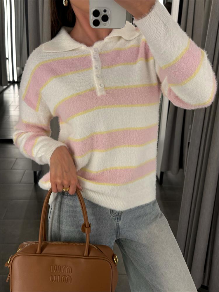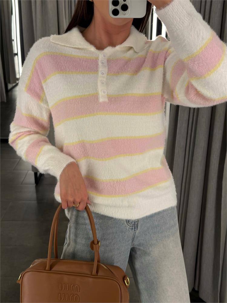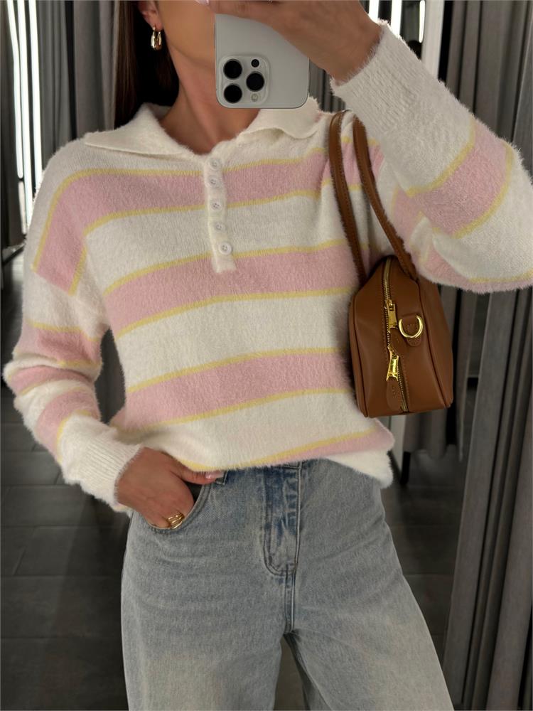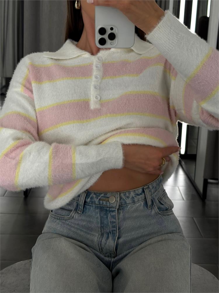 Джемпер-поло пушистый на пуговицах, в полоску 61109