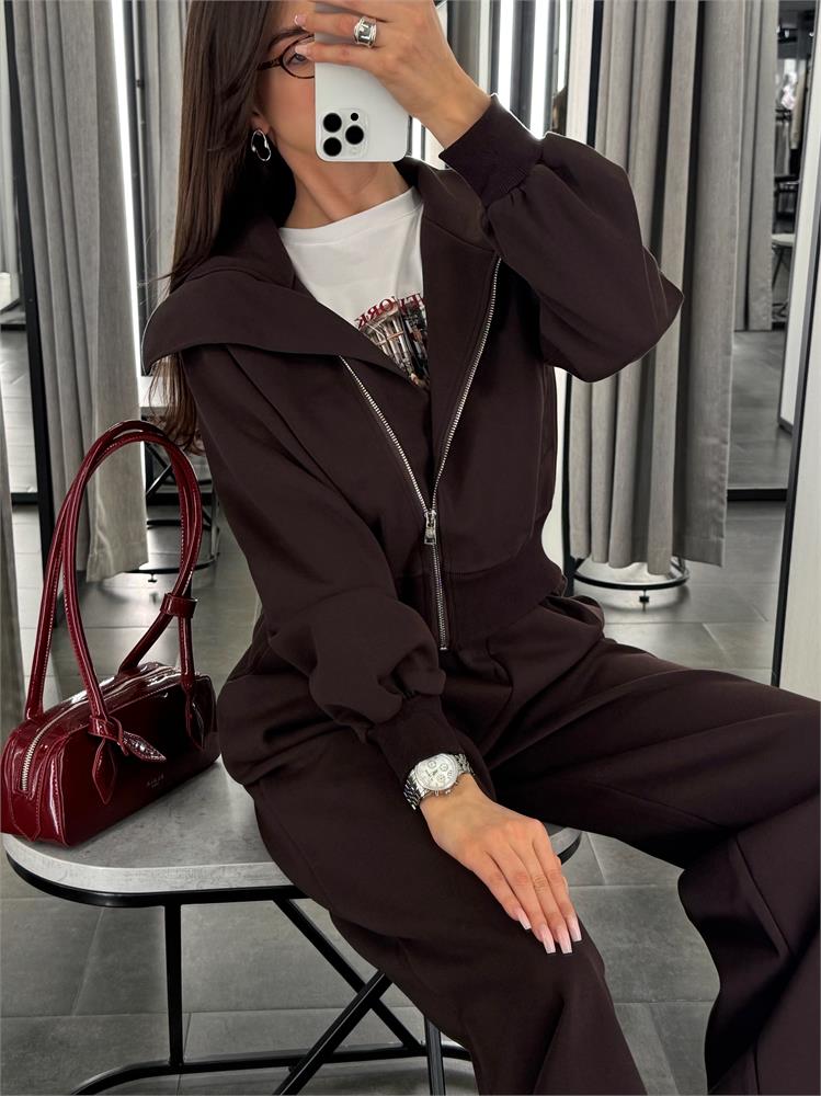 Костюм: толстовка акцентная на молнии+отложной воротничок+брюки-палаццо 9526