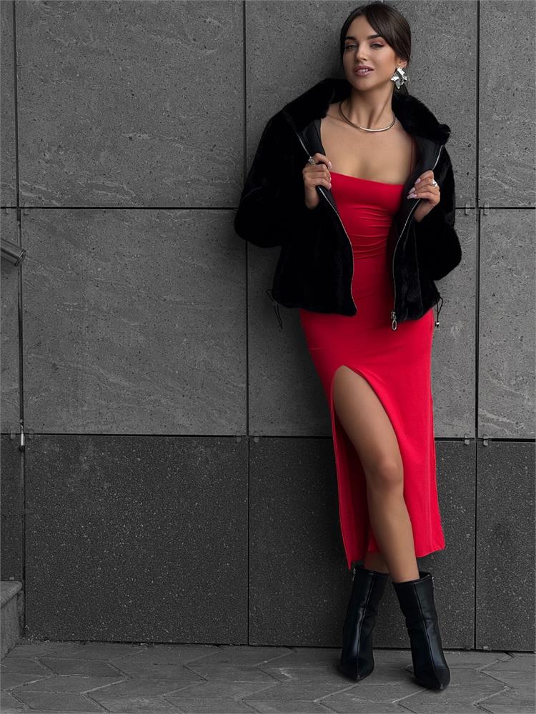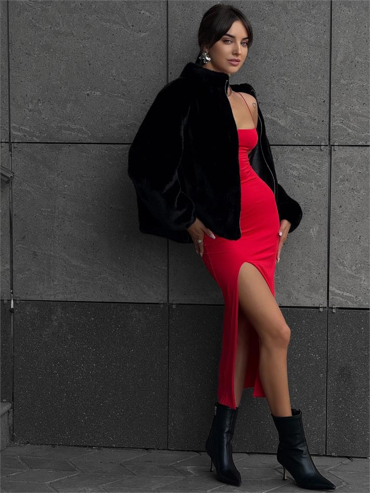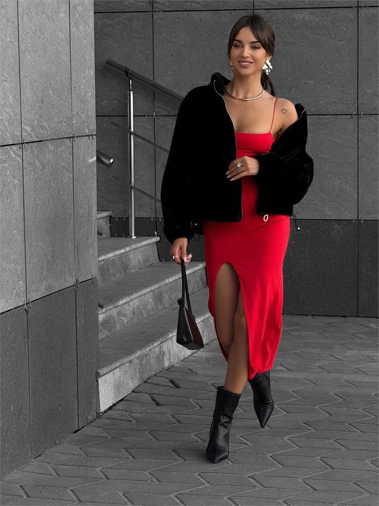 Платье силуэтное на тонких бретелях с акцентным разрезом спереди 2353