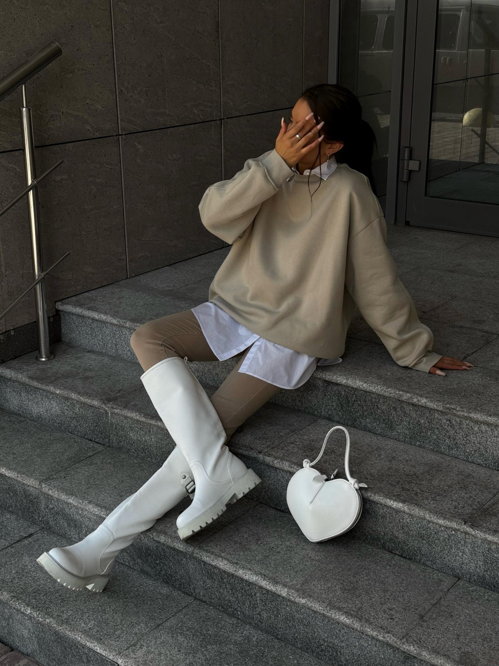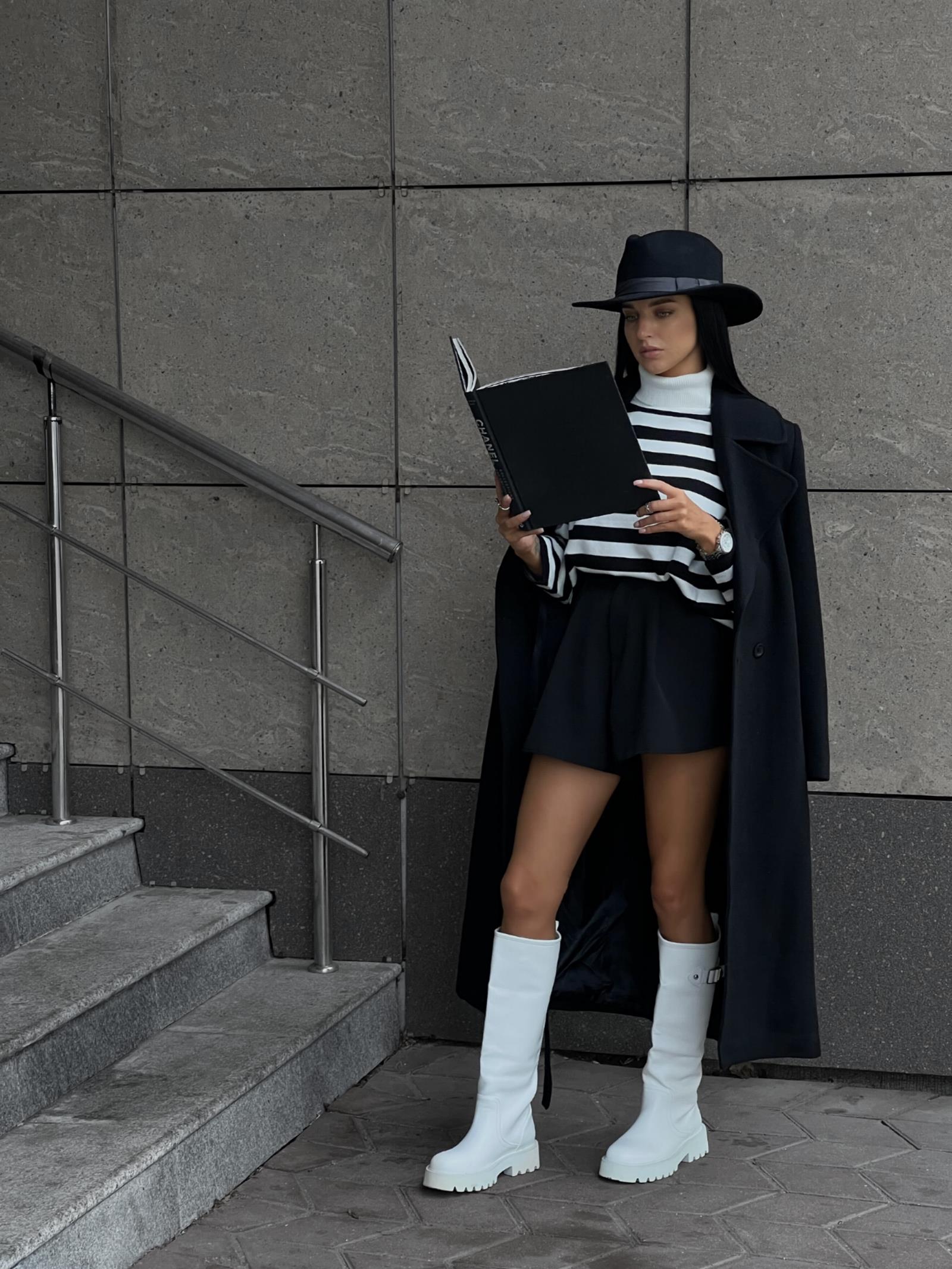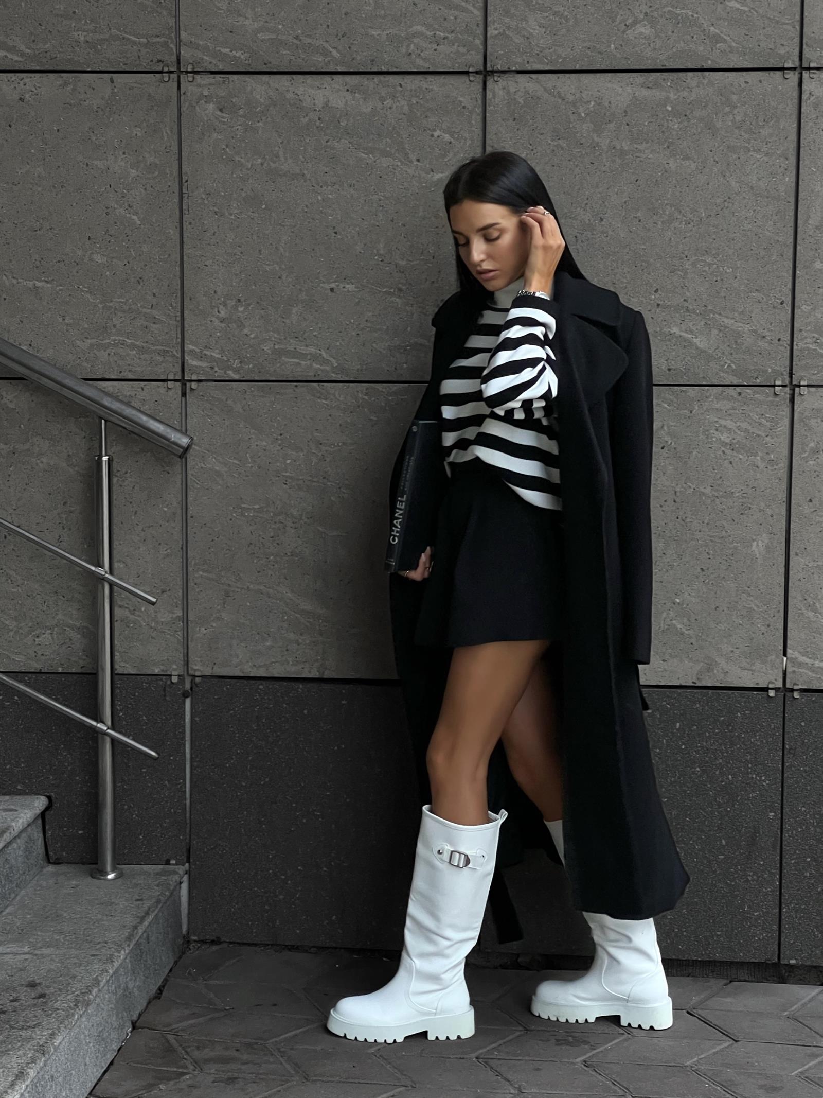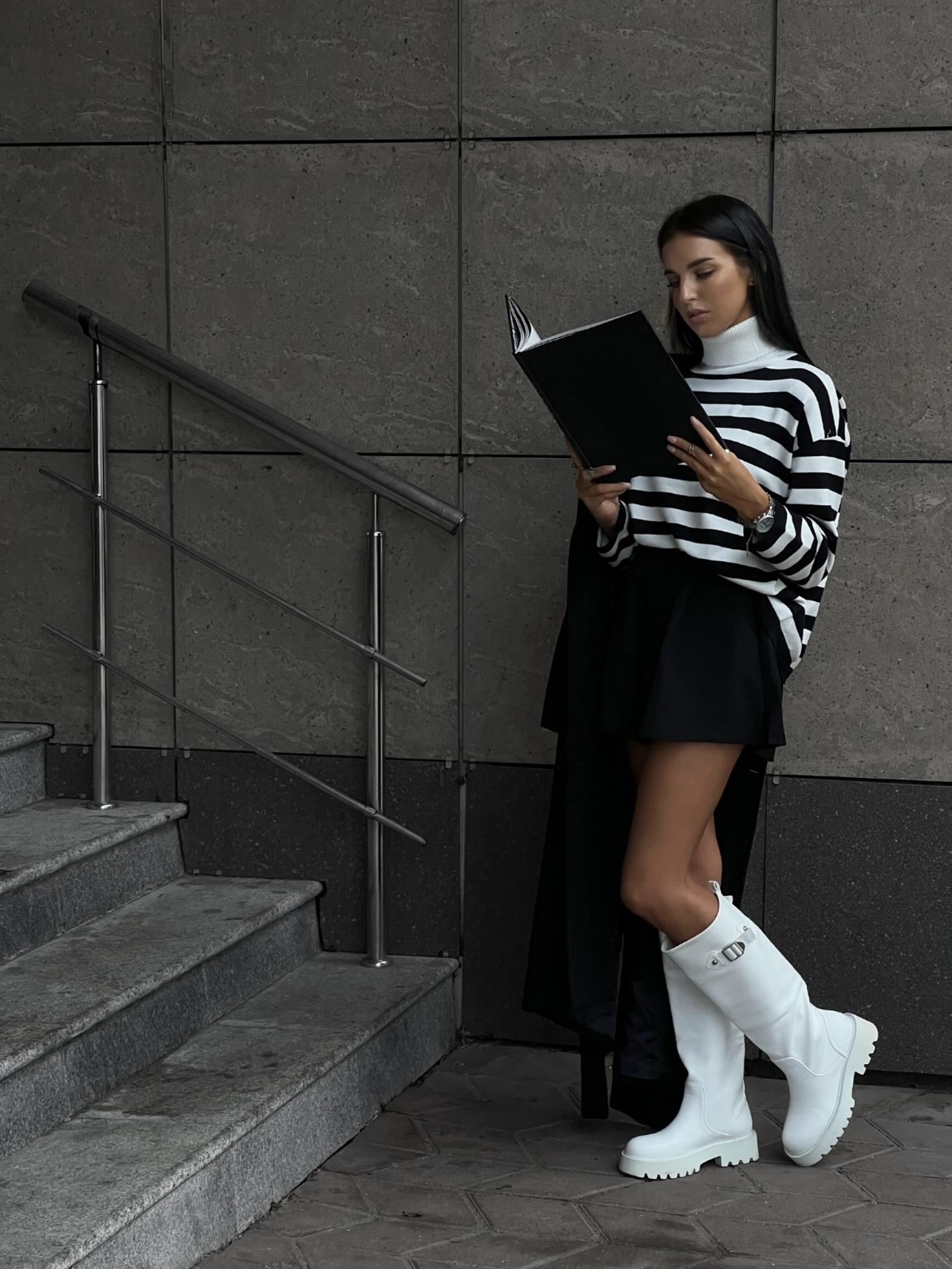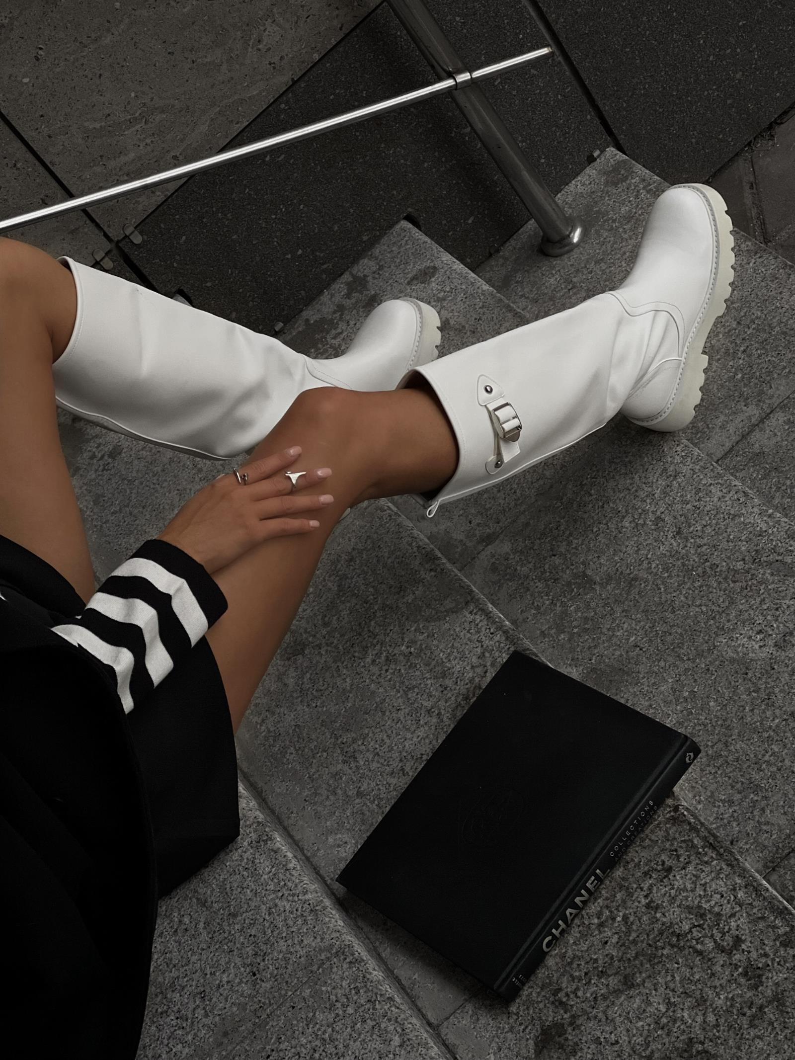 Демисезонные сапоги из экокожи на платформе. Высокое голенище с петелькой сзади, грубая подошва. Акцентный ремешок сбоку голенища.